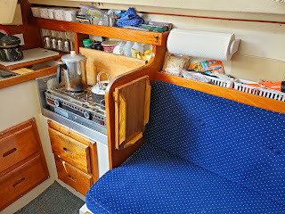 In the mid-1980's I read Bruce Bingham's book, "The Sailor's Sketchbook." This book is chuck full of great ideas to make use-full modifications for your boat. One idea that seemed really good was to add a drop-down table on the bulkhead forward of the stove. This would give added counter space is a small boat.